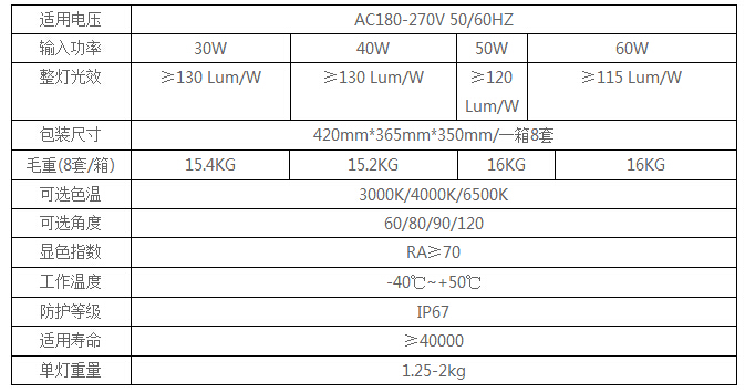 led泛光燈產(chǎn)品特點 1.COB陶瓷光源,4KV耐壓,防雷效果好 2.玻璃透鏡,可靠二次光學(xué),抗黃變,無形變 3.全通透設(shè)計,縱向拉伸,對流效果好,散熱快 4.IP67防水等級,特殊氧化處理簡化燈具設(shè)計 5.多種配光方式,適合做工礦燈、投光燈、泛光燈、應(yīng)用其廣泛 6.光效大于120Lum/W,符合能源之星標(biāo)準(zhǔn),6000H光通維持率95.2% led泛光燈適用范圍: 廠房、車間、倉庫、廣場、廣告牌等等 led泛光燈安裝方式: 支架 吊桿 吊鏈;結(jié)構(gòu)輕巧,安裝方便