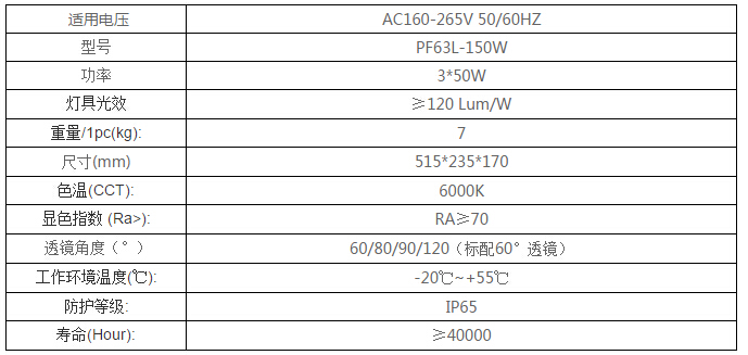 LED泛光燈PF63L-150W主要參數(shù)