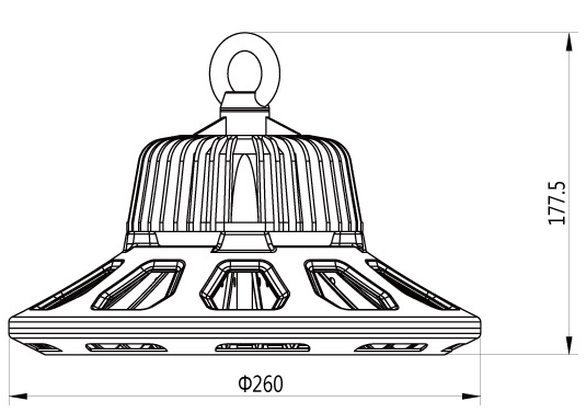 UFO工礦燈產品特點: 1.采用4.0mm厚純鋁板主傳導散熱;加大熱容傳導 2.立體式通風對流散熱;溫升不35° 3.外觀大方,工業感較強、一體式、薄設計 4.純鋁板上、下蓋扣合式結構,燈具堅固,耐用 5.配呼吸器,燈具透氣、干燥、不起霧氣,確保LED光源能在惡劣條件下正常點亮 6.3種透鏡60度、90度、120度,可應用不同場合 7.防護等級IP65 UFO工礦燈適用場所: 適用于車間、倉庫、廠房、天棚、公園、廣場、運動場所等照明。