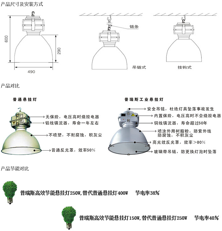 應用場所: 工業(yè)廠房、體育場、候車大廳、機場、博物館、商場、市、店鋪、各種專賣店。 電器配置: 》鎮(zhèn)流器:通過CE,CCC認證的帶過熱保護鎮(zhèn)流器,防止光源壽命終結時產生的整流效應而導致意外發(fā)生。 》觸發(fā)器:通過CE,CQC認證的三線串聯(lián)式TC105℃觸發(fā)器。 》電容器:通過CE,CQC,UL認證TCTC105℃的防爆自愈式鋁殼電容器。 可選用智能觸發(fā)器,具有自動檢測和延時關閉功能,能有效延長光源和電器的壽命,降低維護成本及避免維護時產生電氣安全隱患。 直接吊裝安裝、吊裝安裝、主電源線經安裝系統(tǒng)走線。 產品參數信息: