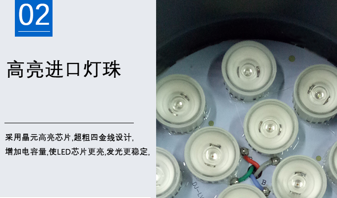 2、采用晶元高亮芯片,粗四金線設計,增加電容量,使LED芯片更亮,發光更穩定